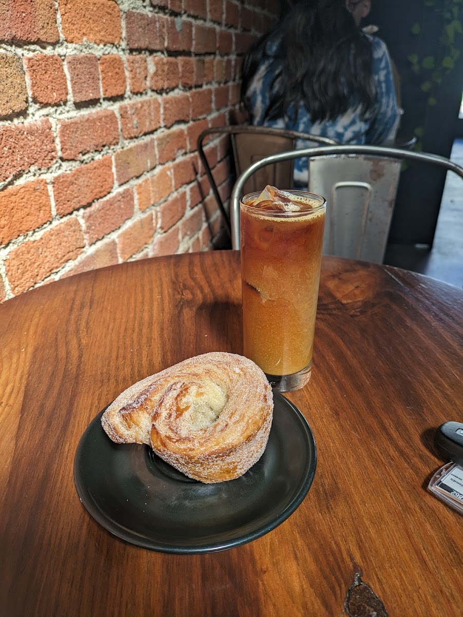 Good find while in the area. The coffee is delicious I highly recommend it the roast they do is very good. I had a morning bun and they have some great pastries. The menu doesn't have prices and the bathroom was a little dirty. They play pretty loud music so it might not be the best place for a quiet conversation. Nice staff and overall great coffee.